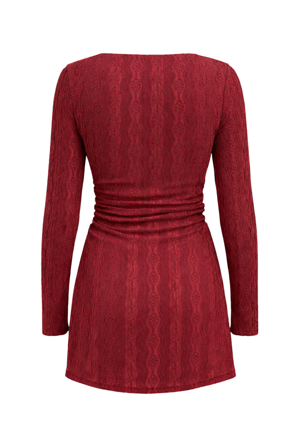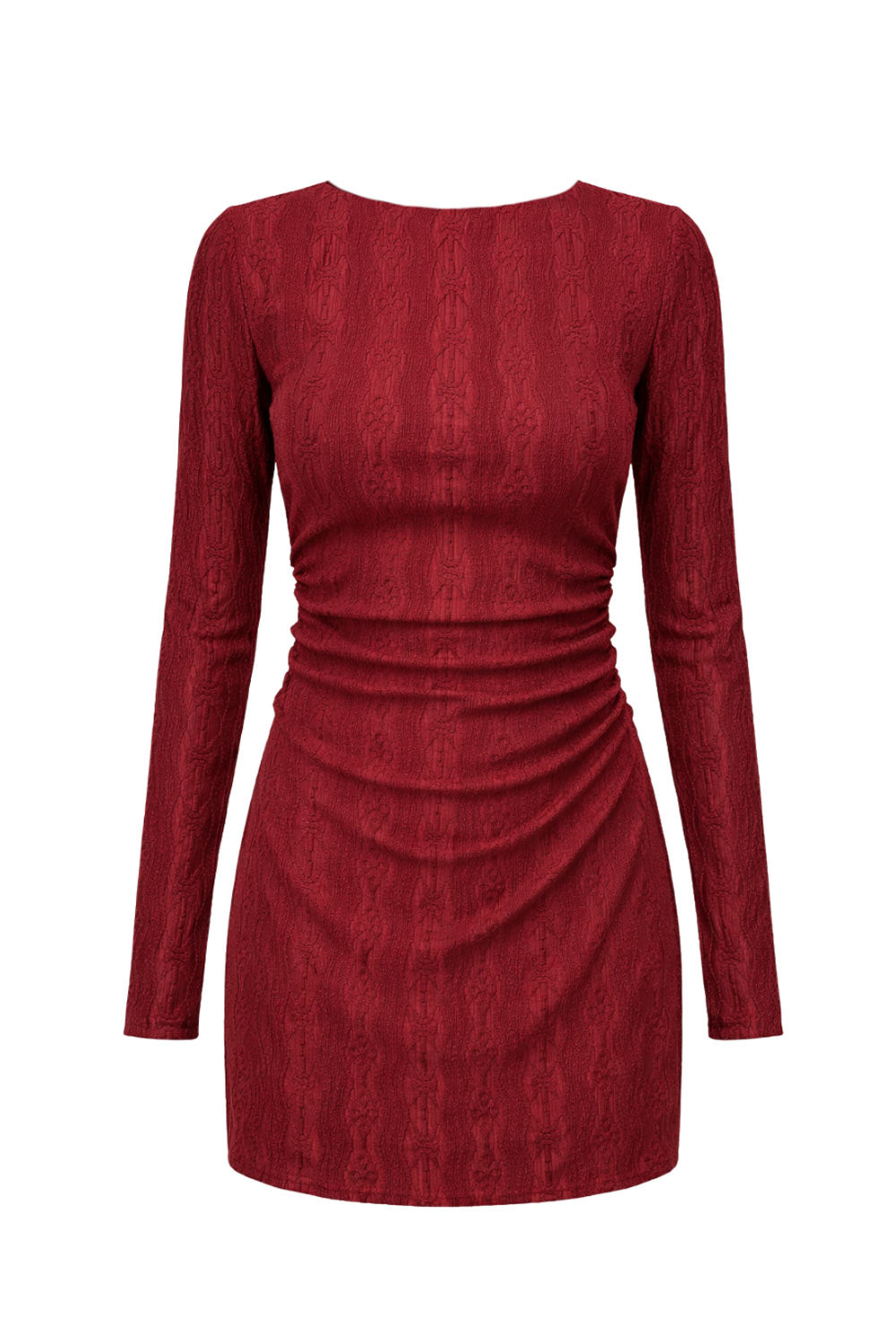 Vestido corto de fit ajustado, cuello barco, manga larga, plisados laterales en cintura y detalle de textura en tejido.