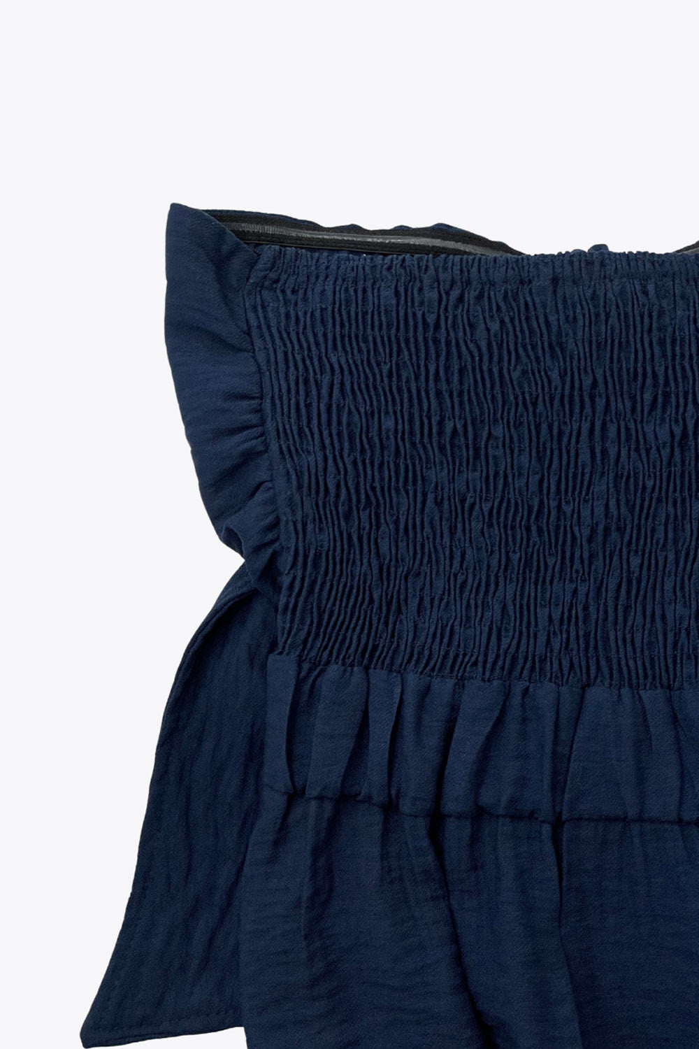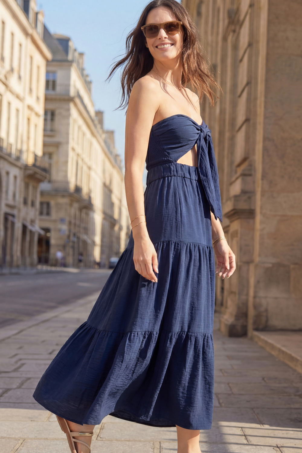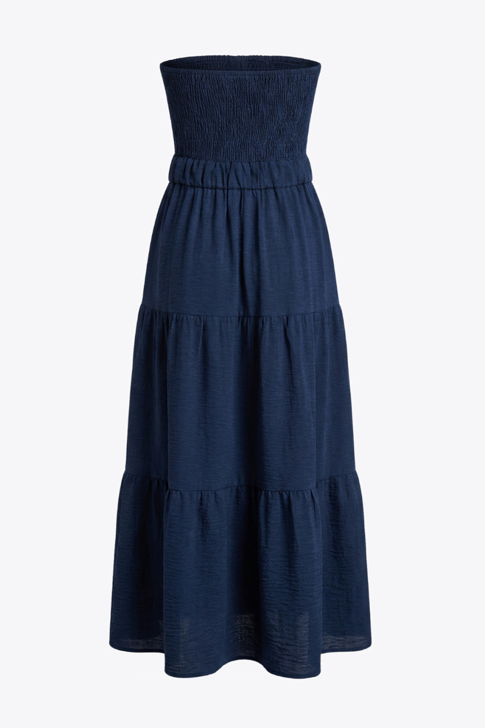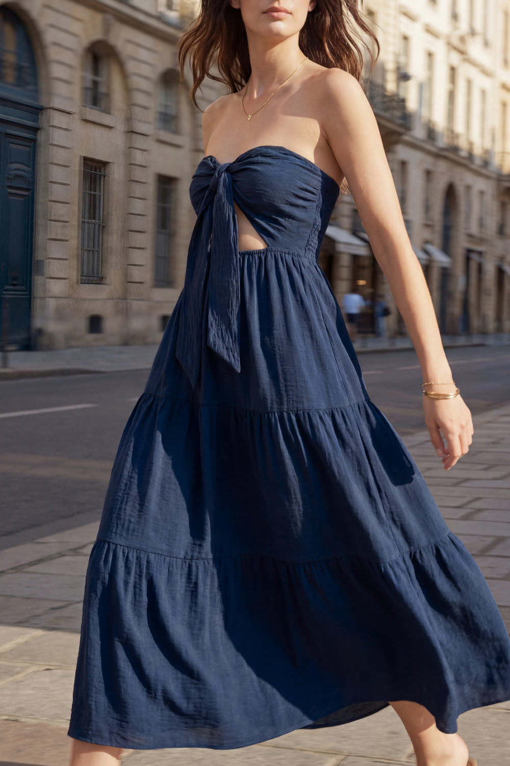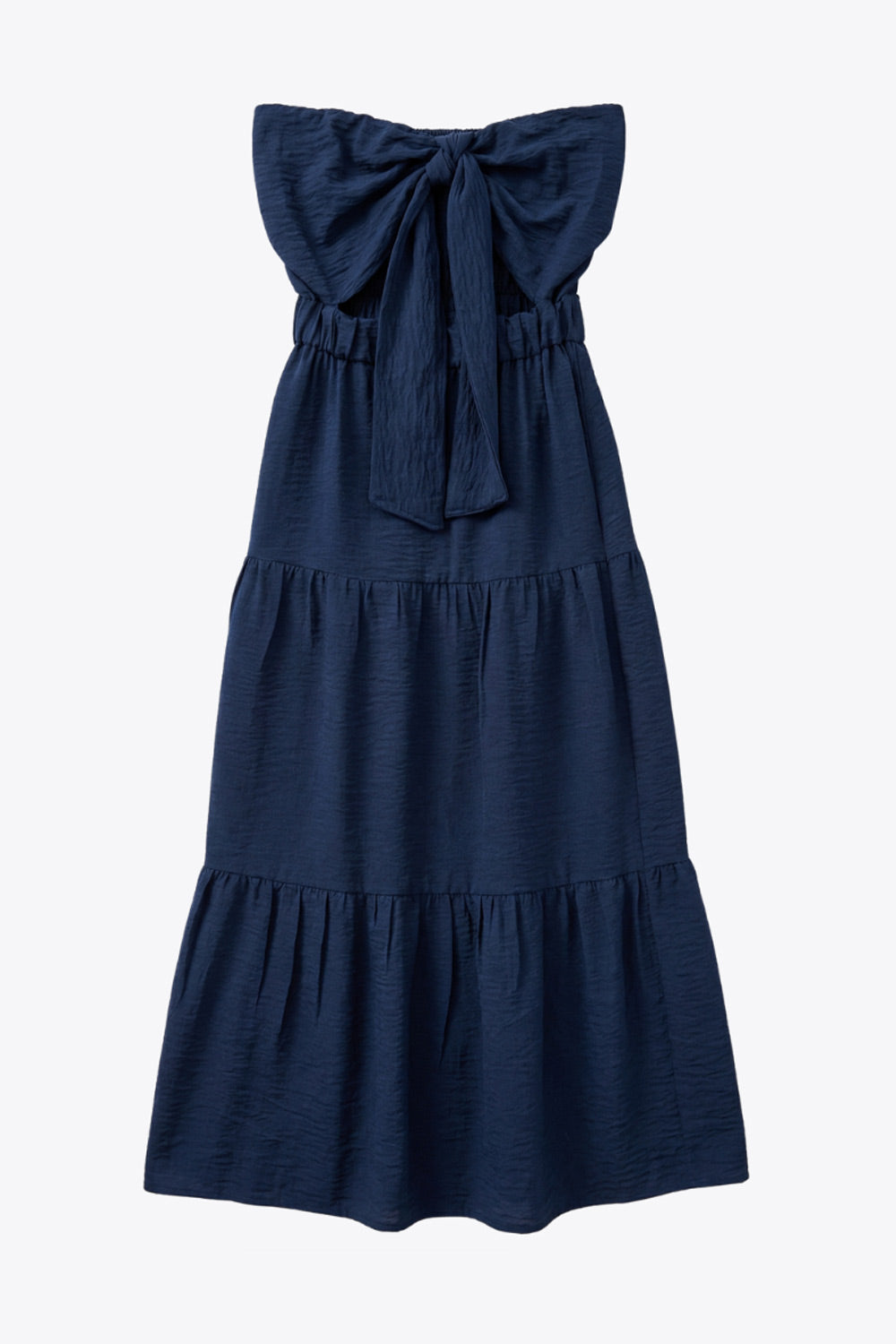 Vestido midi strapless de escote corazón con nudo amarrable, cut out frontal, cintura elástica, detalle de capas de olanes en bajo y fruncido en espalda.