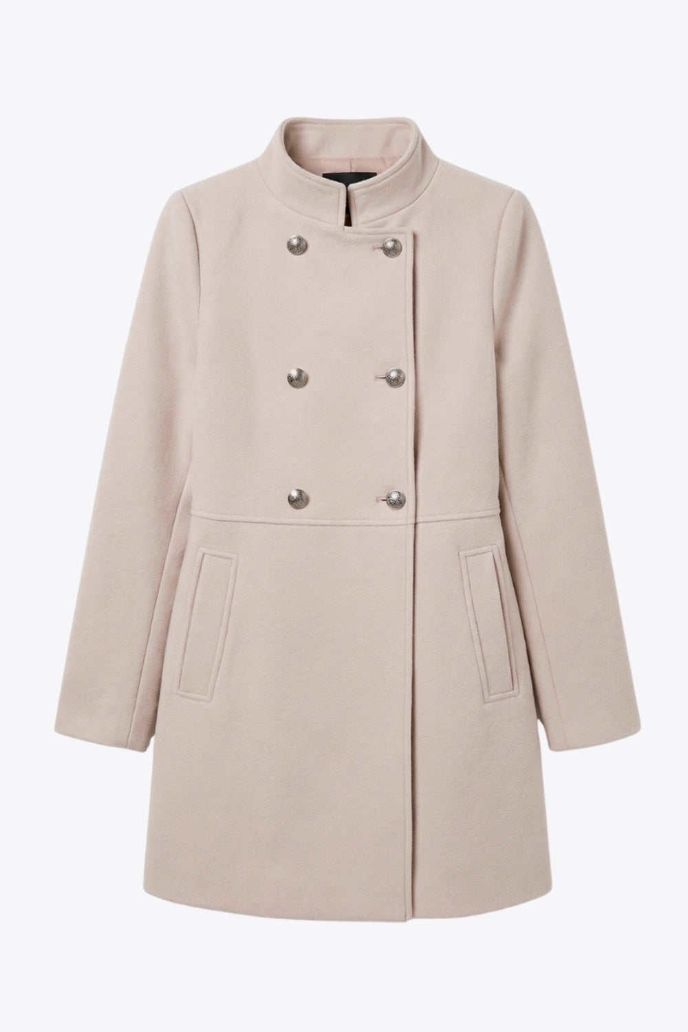 Abrigo cruzado de fit recto, manga larga, cuello alto, bolsillos delanteros con vivos, corte en cintura y cierre frontal con doble cruce de botones en contraste.