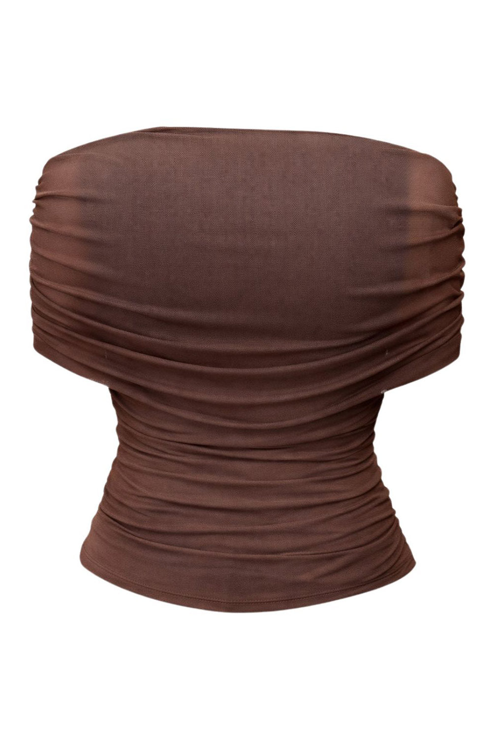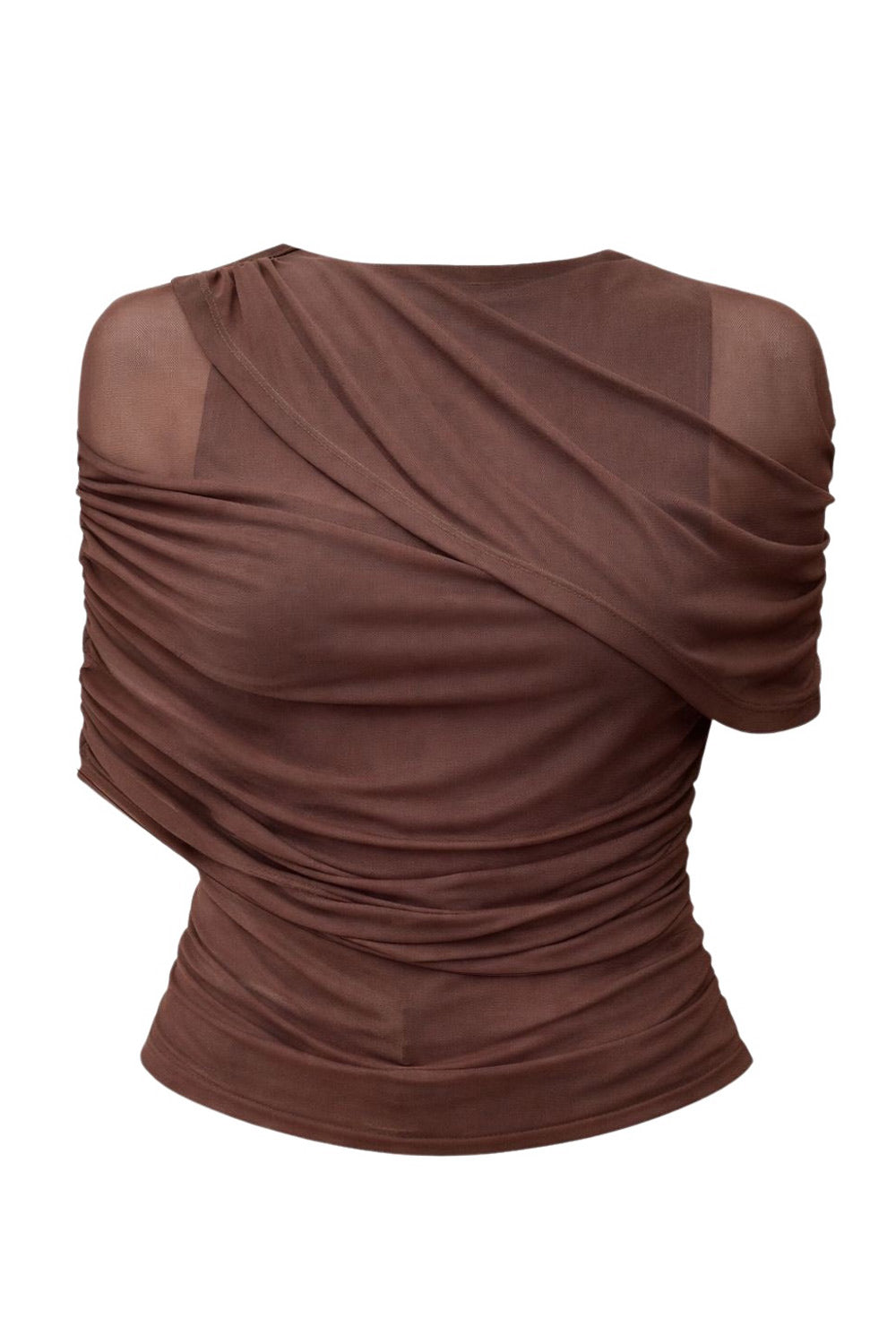 Blusa de mesh, fit ajustado, plisados en costados, cuello barco, detalle decorativo de capas con plisados y manga corta seguidos.