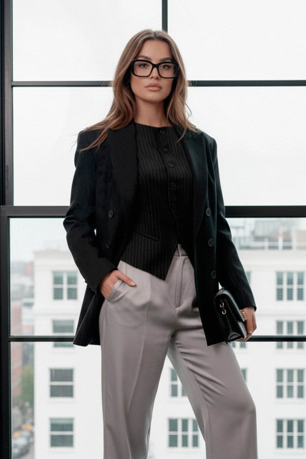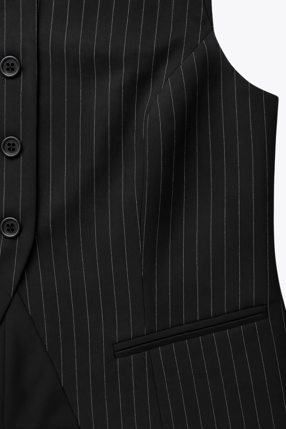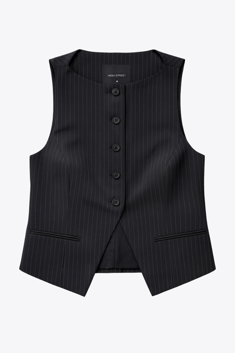 Chaleco de estampado rayas, fit recto, cuello barco, pinzas frontales, vivos decorativos, abertura en bajo y cierre frontal con hilera de botones.