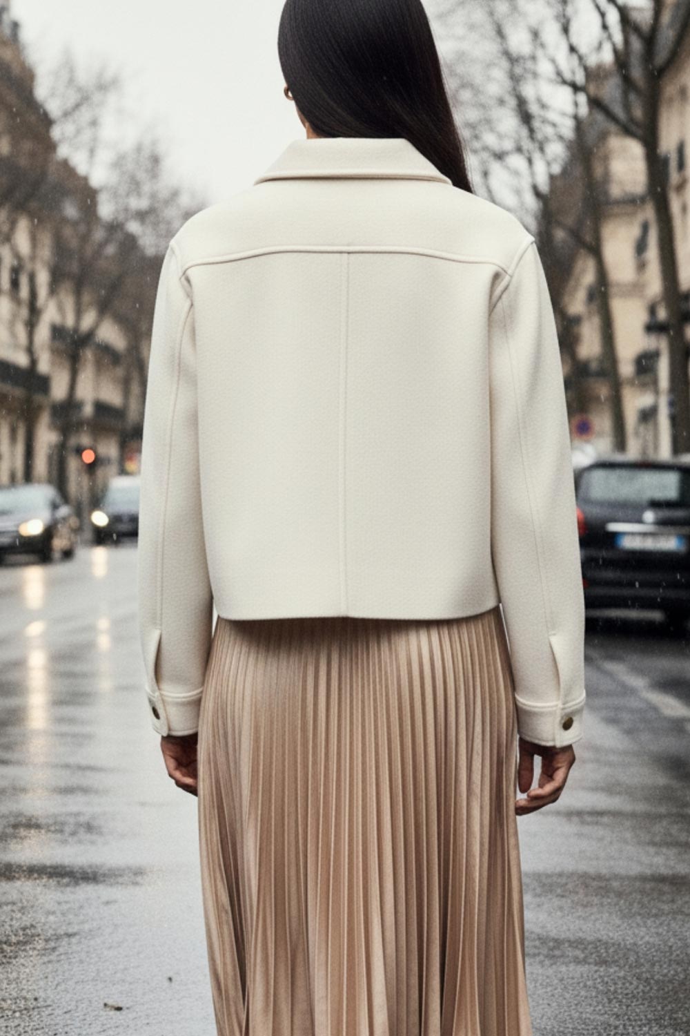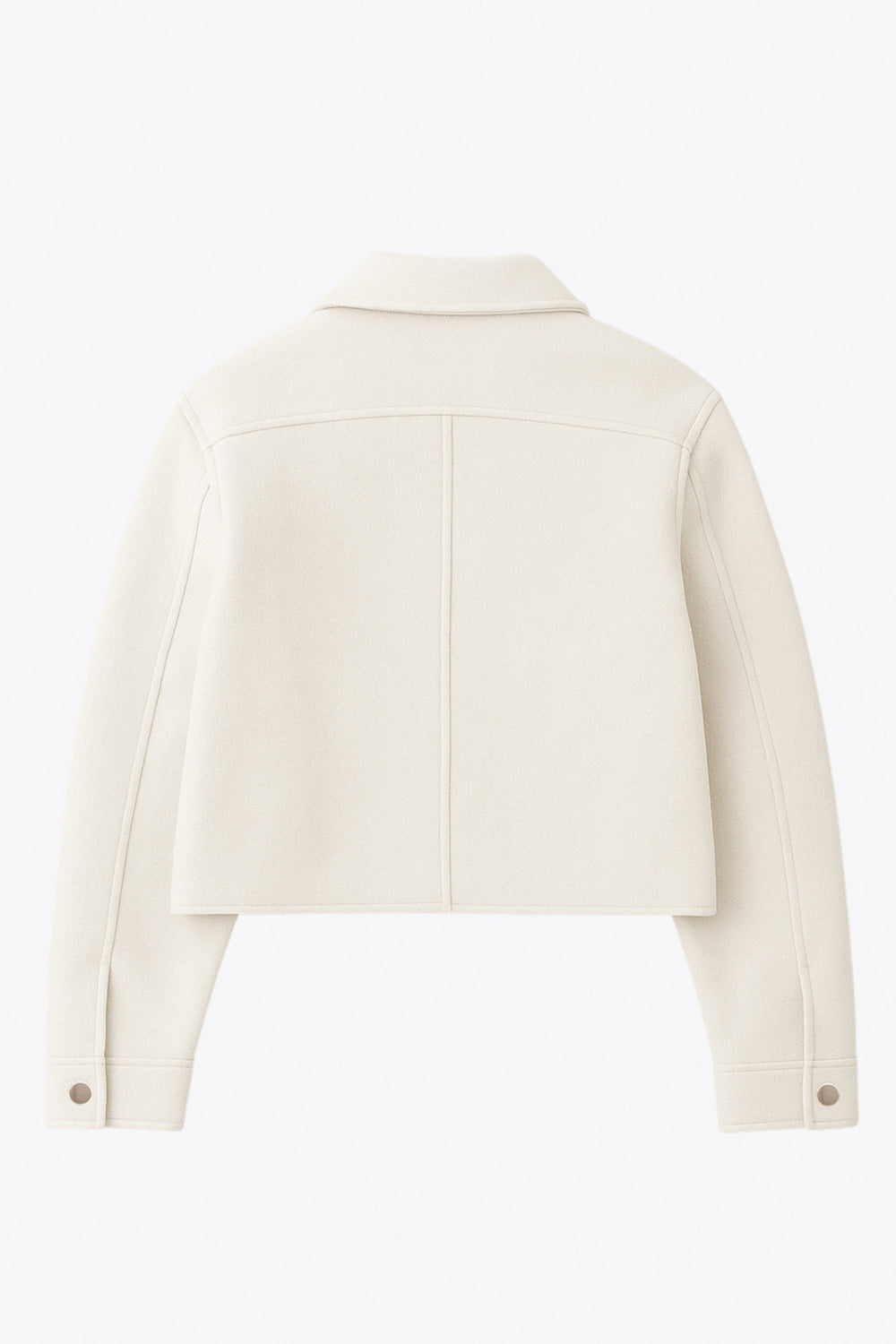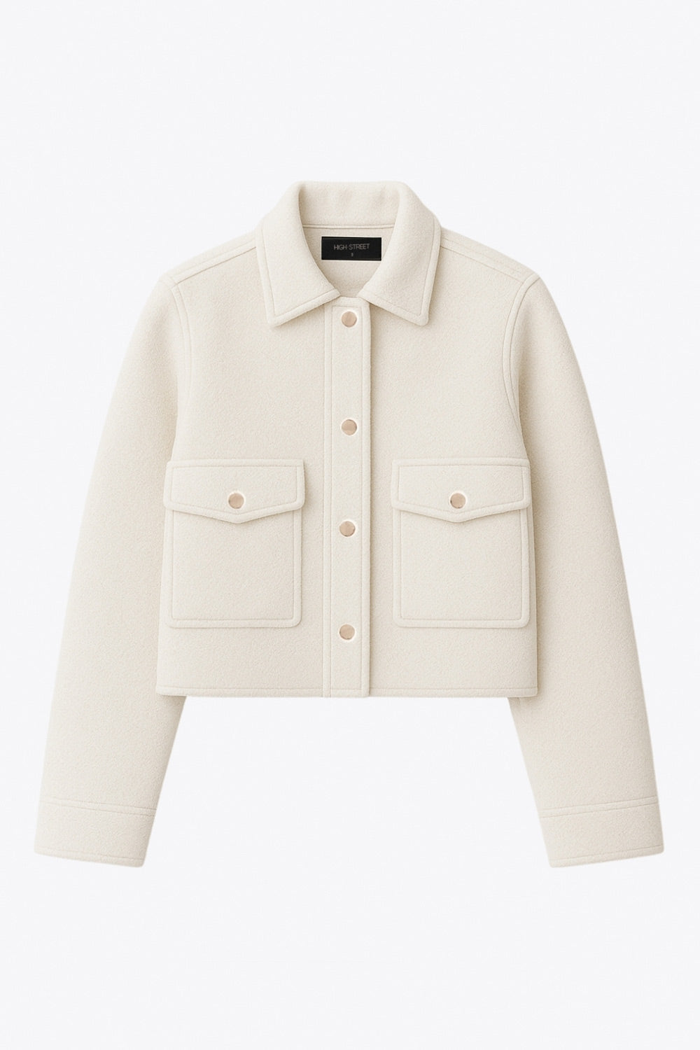Chamarra corta de fit recto, cuello camisero, manga larga con puño abotonado, bolsillos delanteros con cartera y botón. Cierre frontal con hilera de botones en contraste.