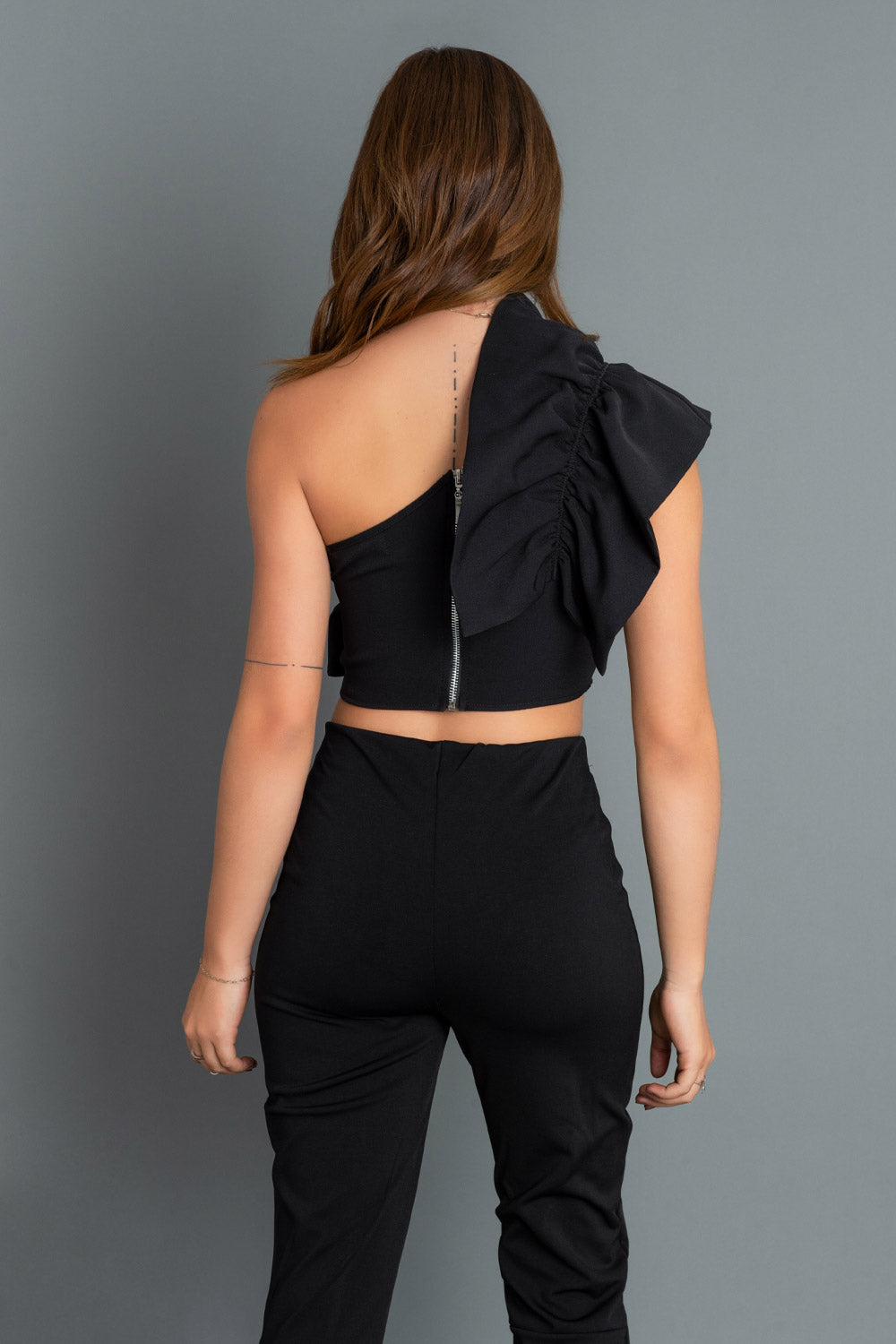 Crop top asimétrico de fit ajustado, un hombro, manga con detalle frontal de olanes y cierre posterior con cremallera visible en contraste.