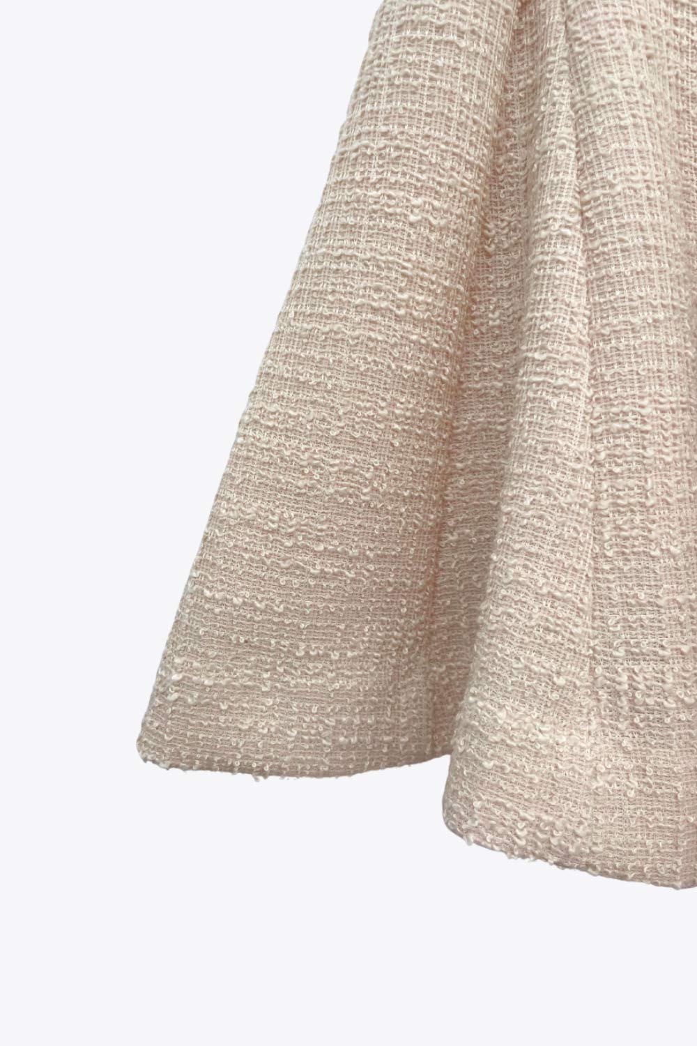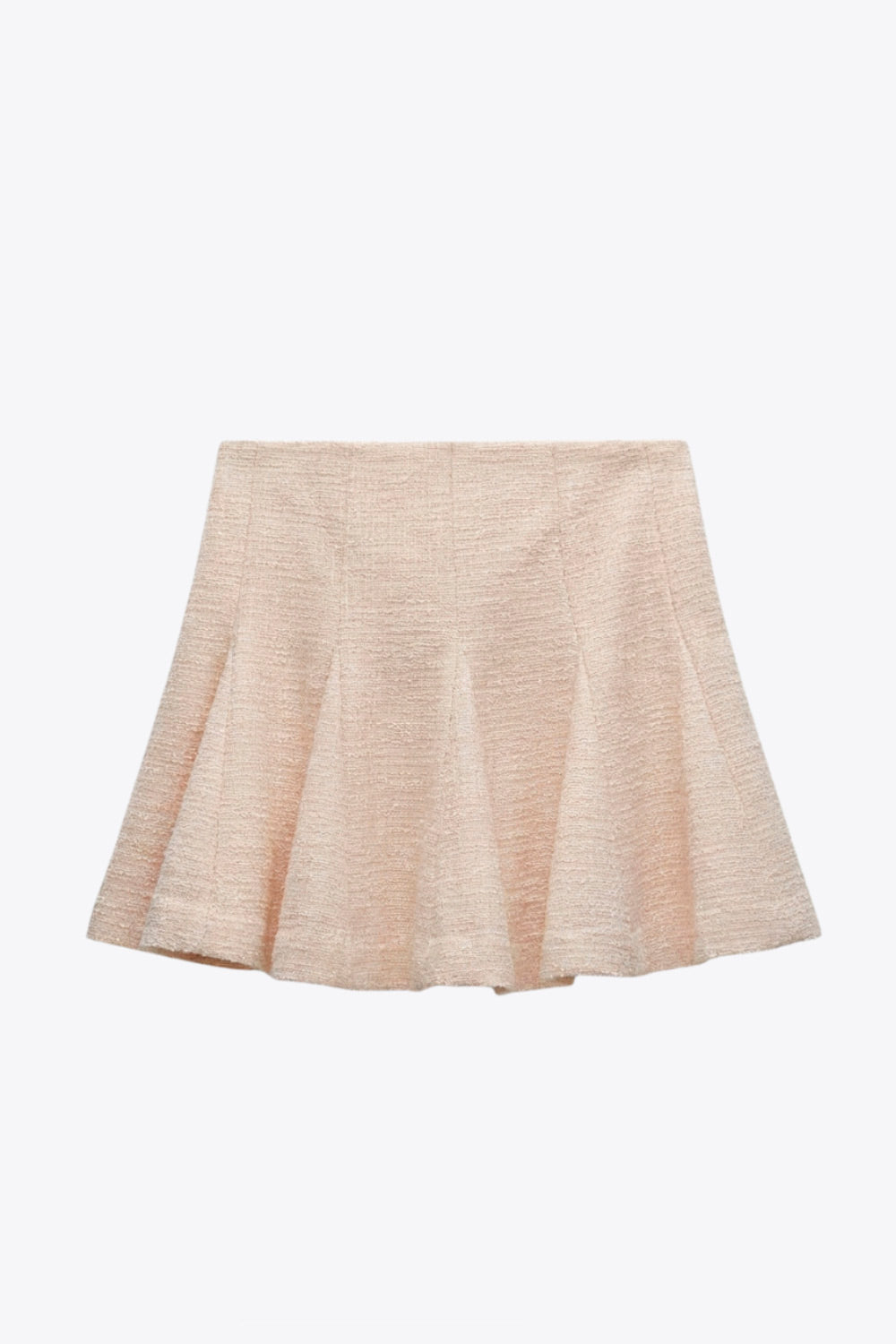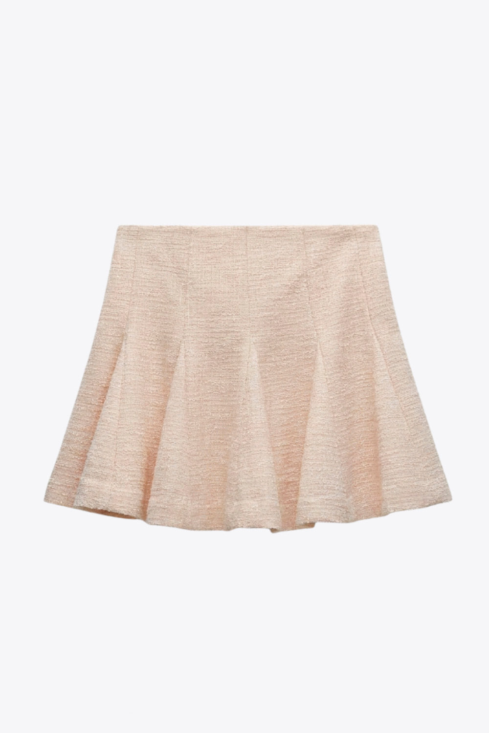 Falda short corto de bouclé, cintura alta, corte en a y olanes en bajo.
