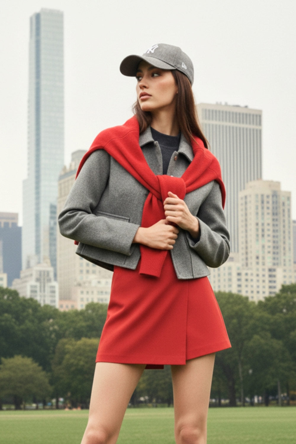 Falda short corto de fit ajustado, cintura alta, cruce frontal con bajo asimétrico, vivos decorativos posterior y cierre lateral con cremallera oculta.