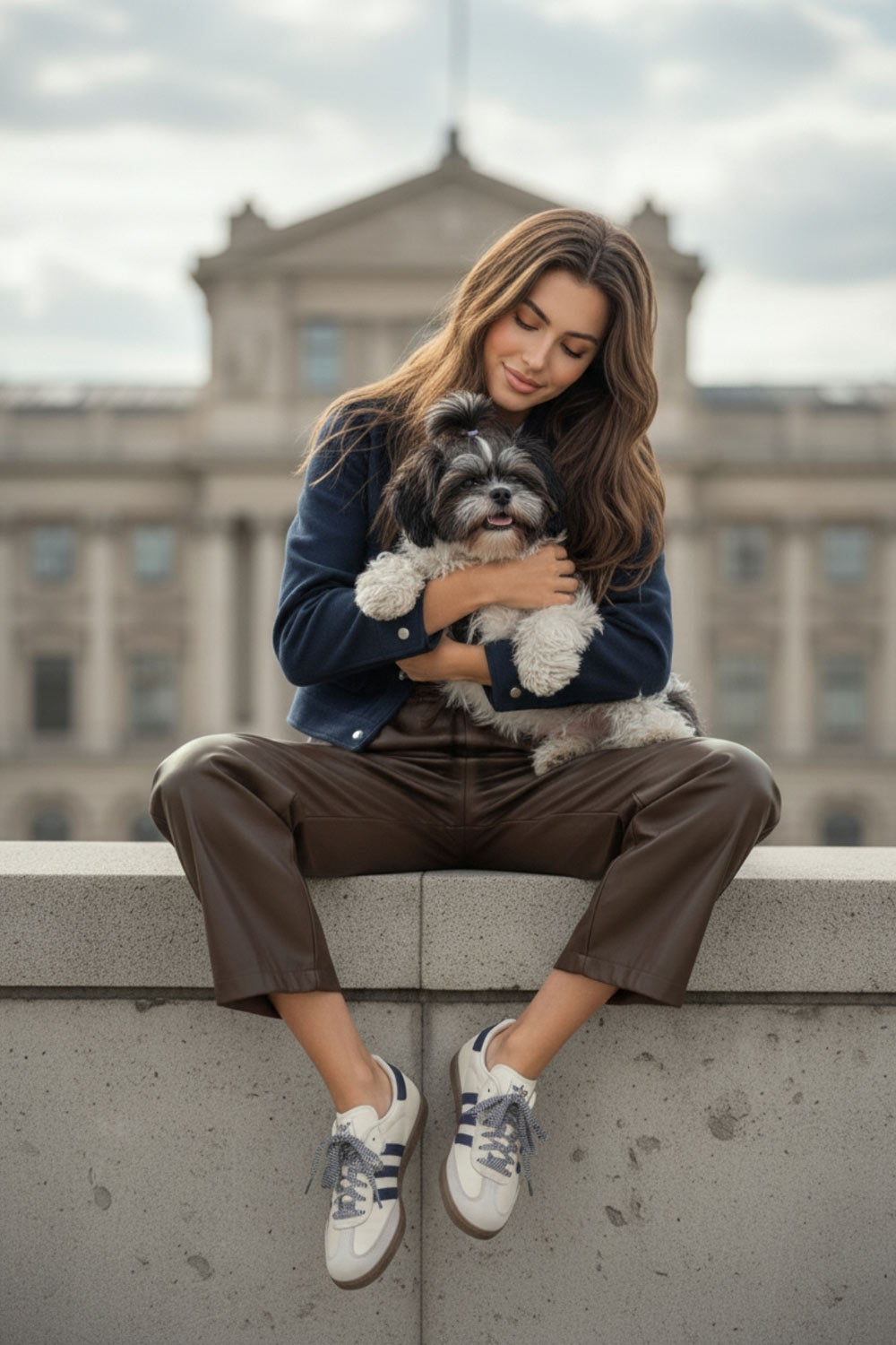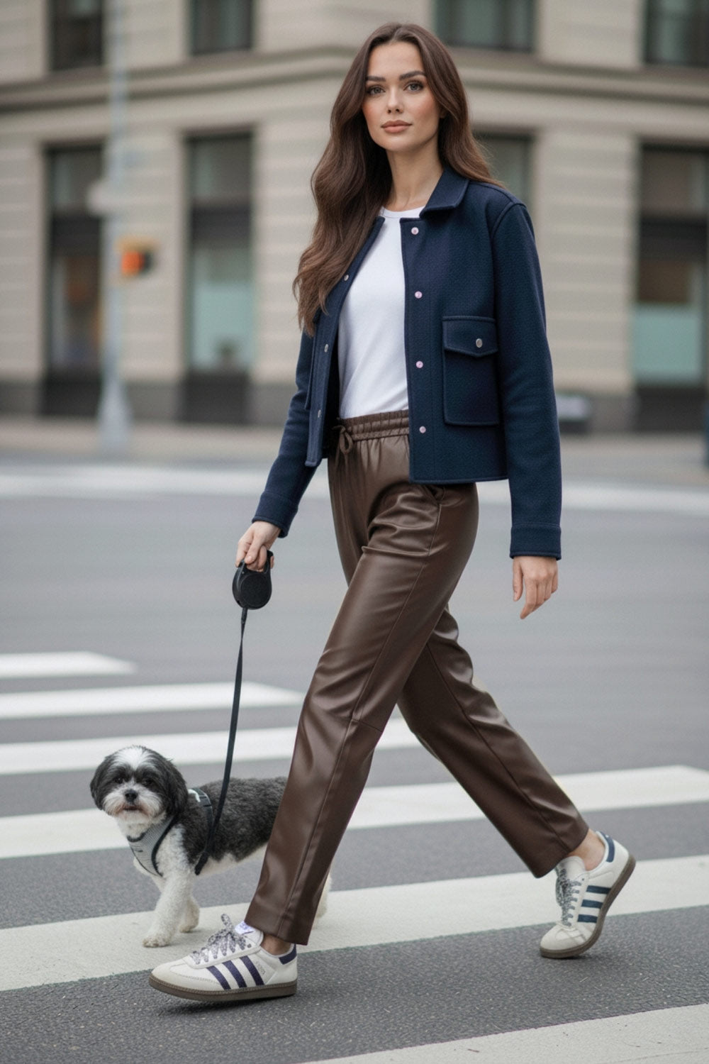 Pantalón de efecto piel, fit recto, bolsillos delanteros, cintura alta con pretina elástica y jareta frontal ajustable. Detalle de costuras posteriores decorativas.