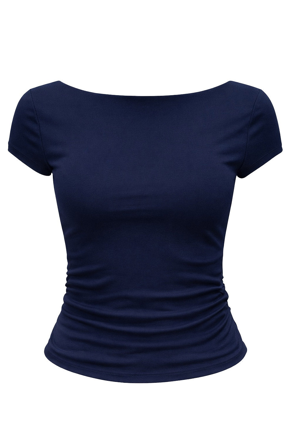 Top de fit ajustado, manga corta, cuello barco y escote en espalda con lazo amarrable posterior.
