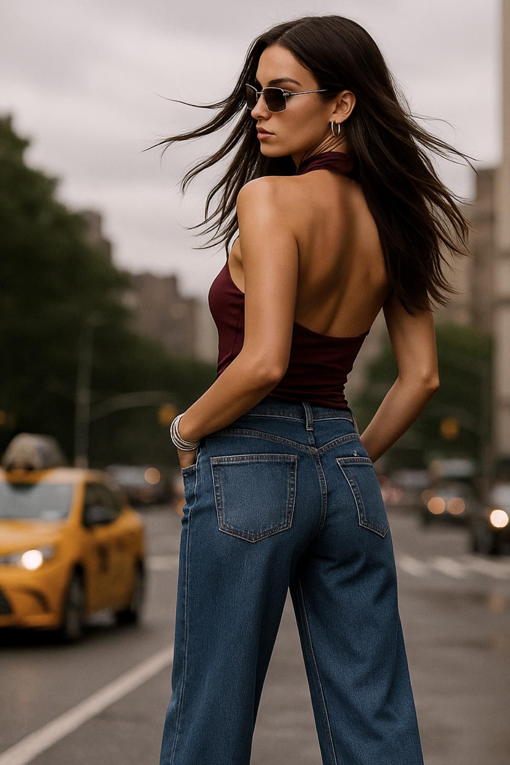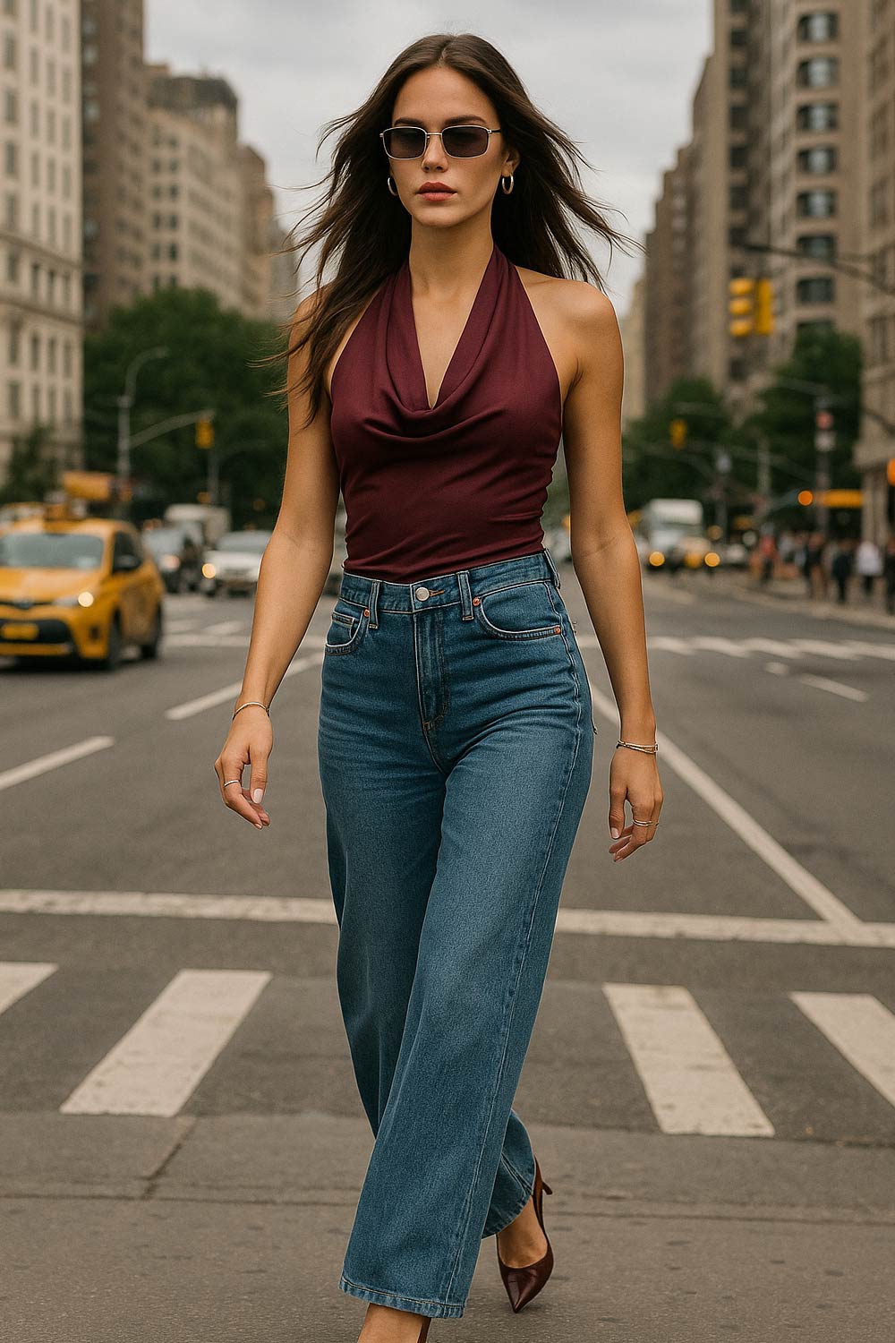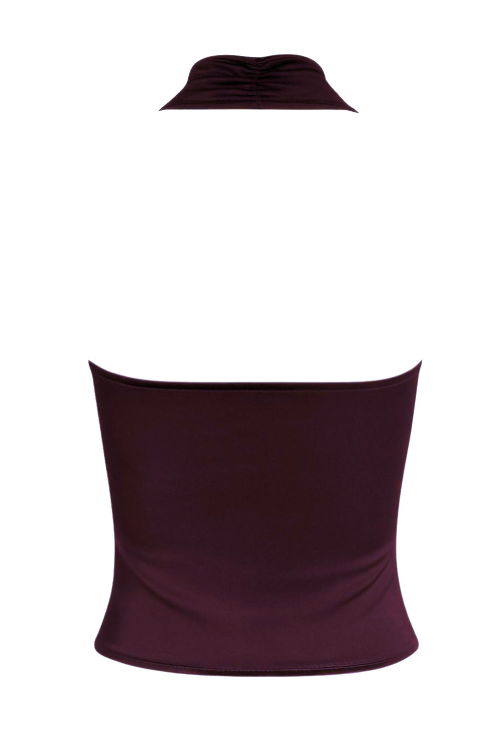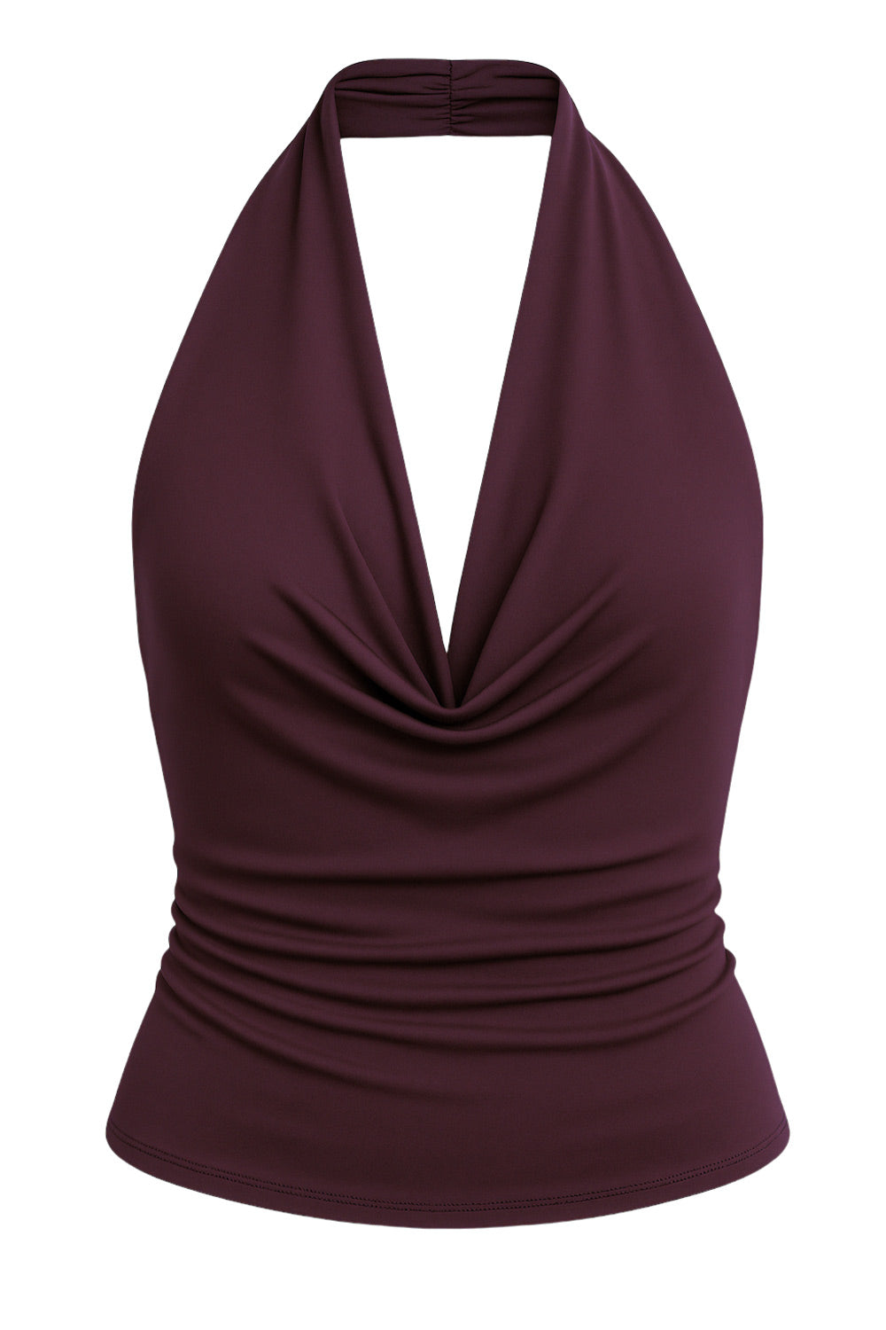 Top corto ajustado de cuello halter con escote fluido, sin mangas, escote en espalda, cierre posterior con botón y ojal.