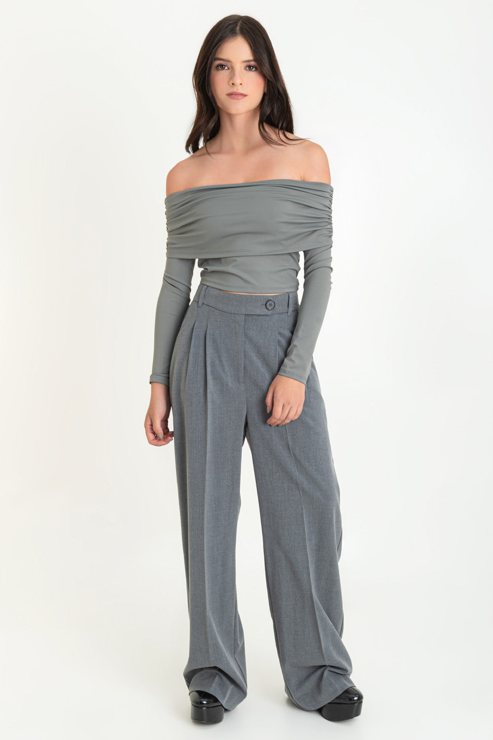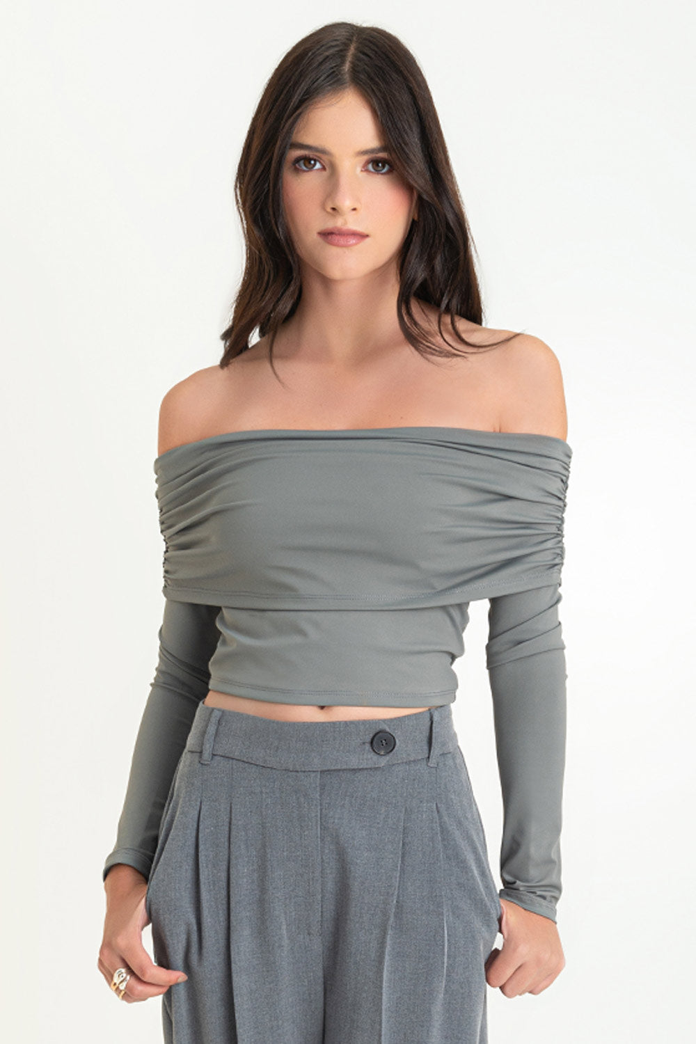 Top corto de fit ajustado, manga larga, hombros descubiertos, escote recto con doblez en borde y detalle de plisados decorativos en costados.