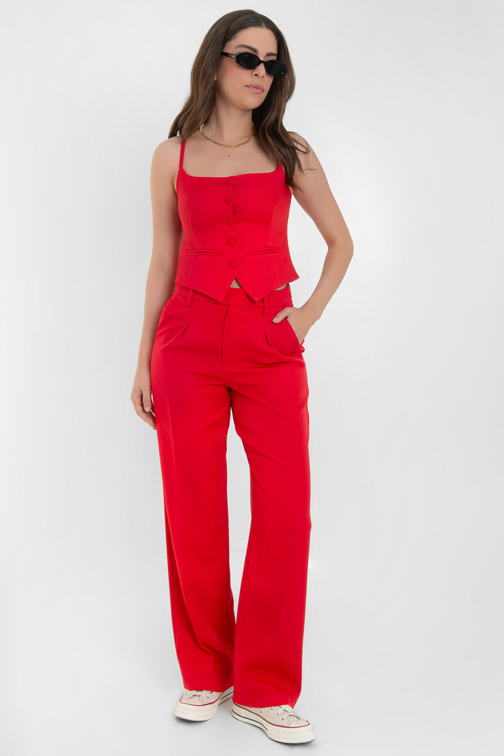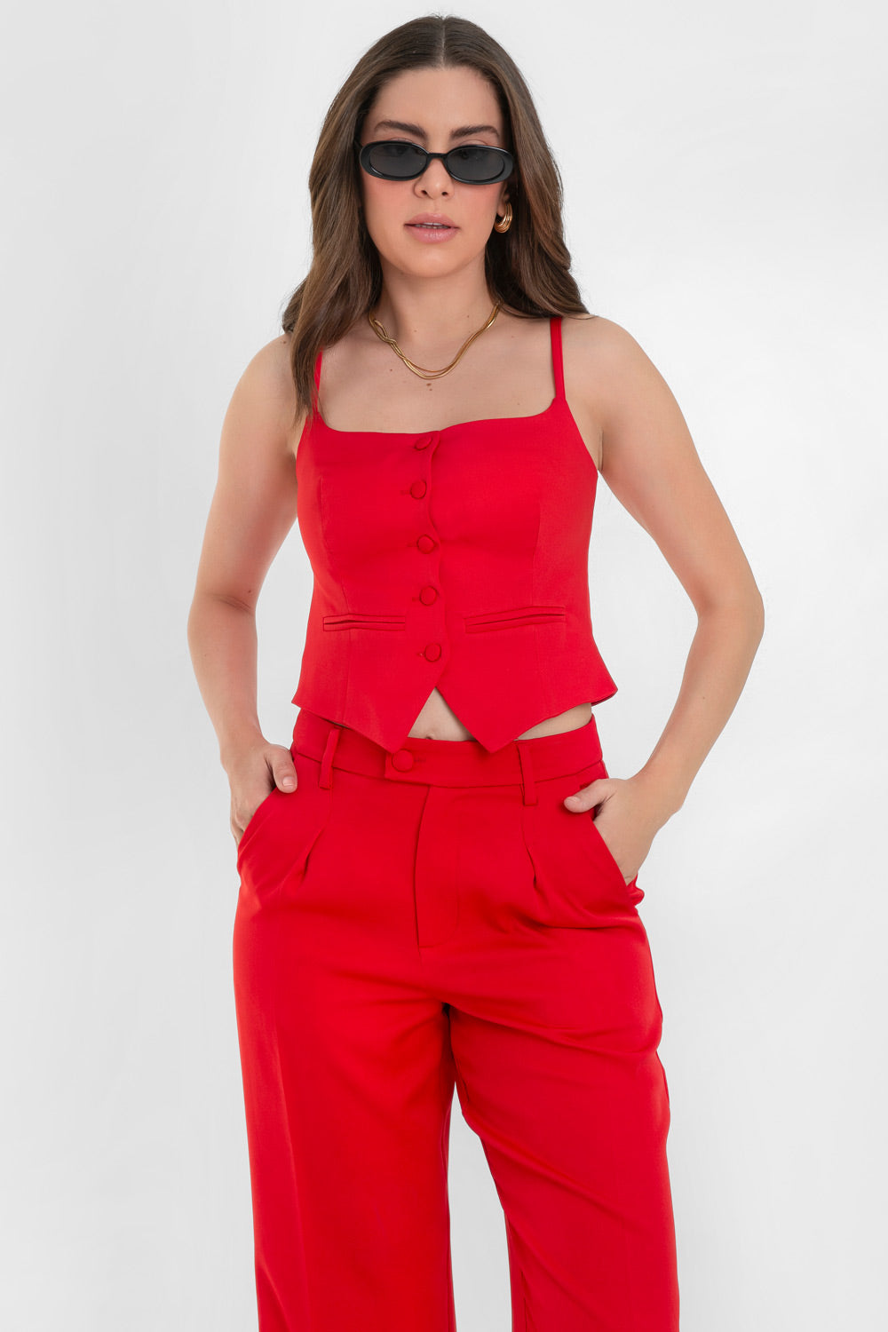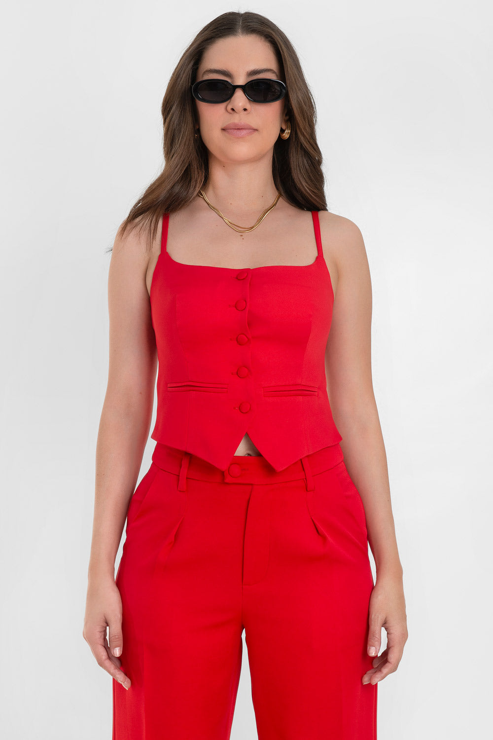 Top corto de fit ajustado, pinzas frontales, escote recto, tirantes delgados, vivos decorativos y cierre frontal con hilera de botones forrados. Detalle bajo v frontal.