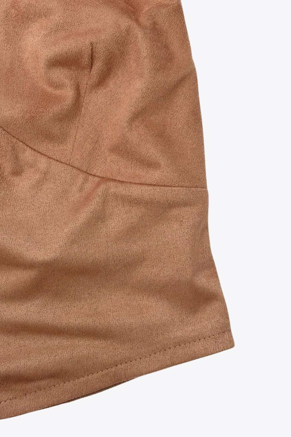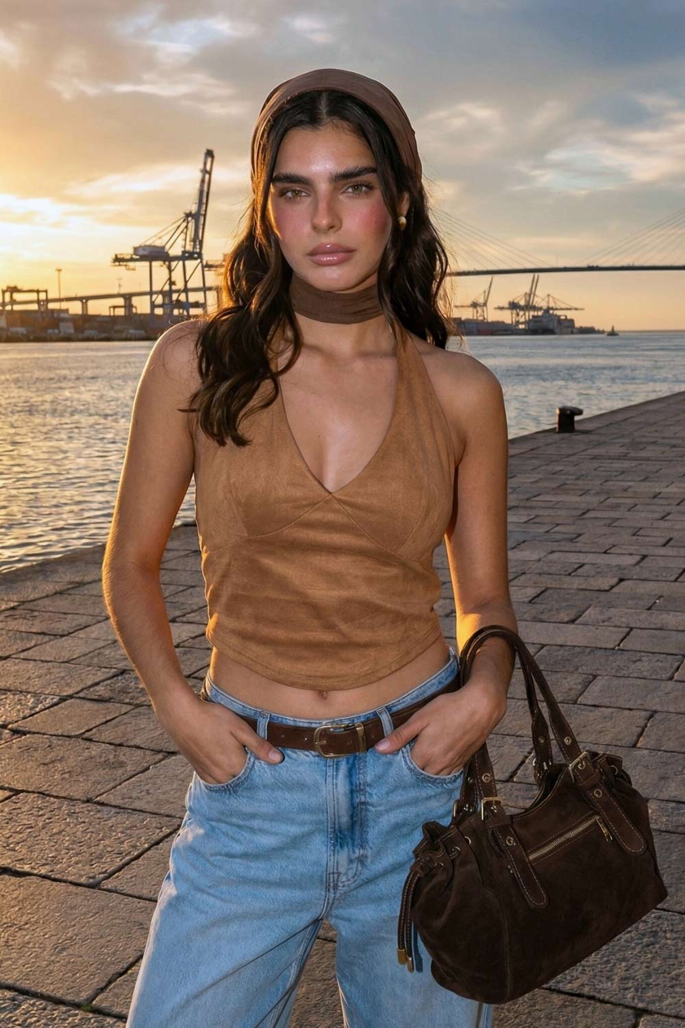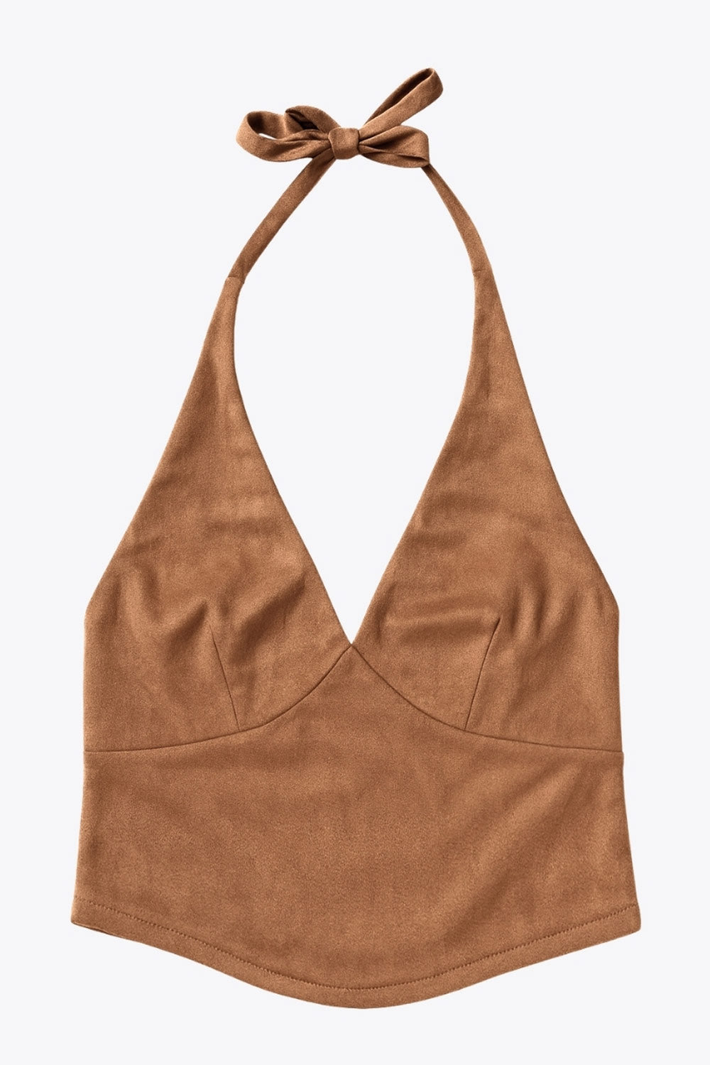 Top corto de gamuza, cuello halter con lazo amarrable posterior, escote v con cortes frontales, bajo v frontal, escote en espalda y cierre posterior con lazo amarrable.