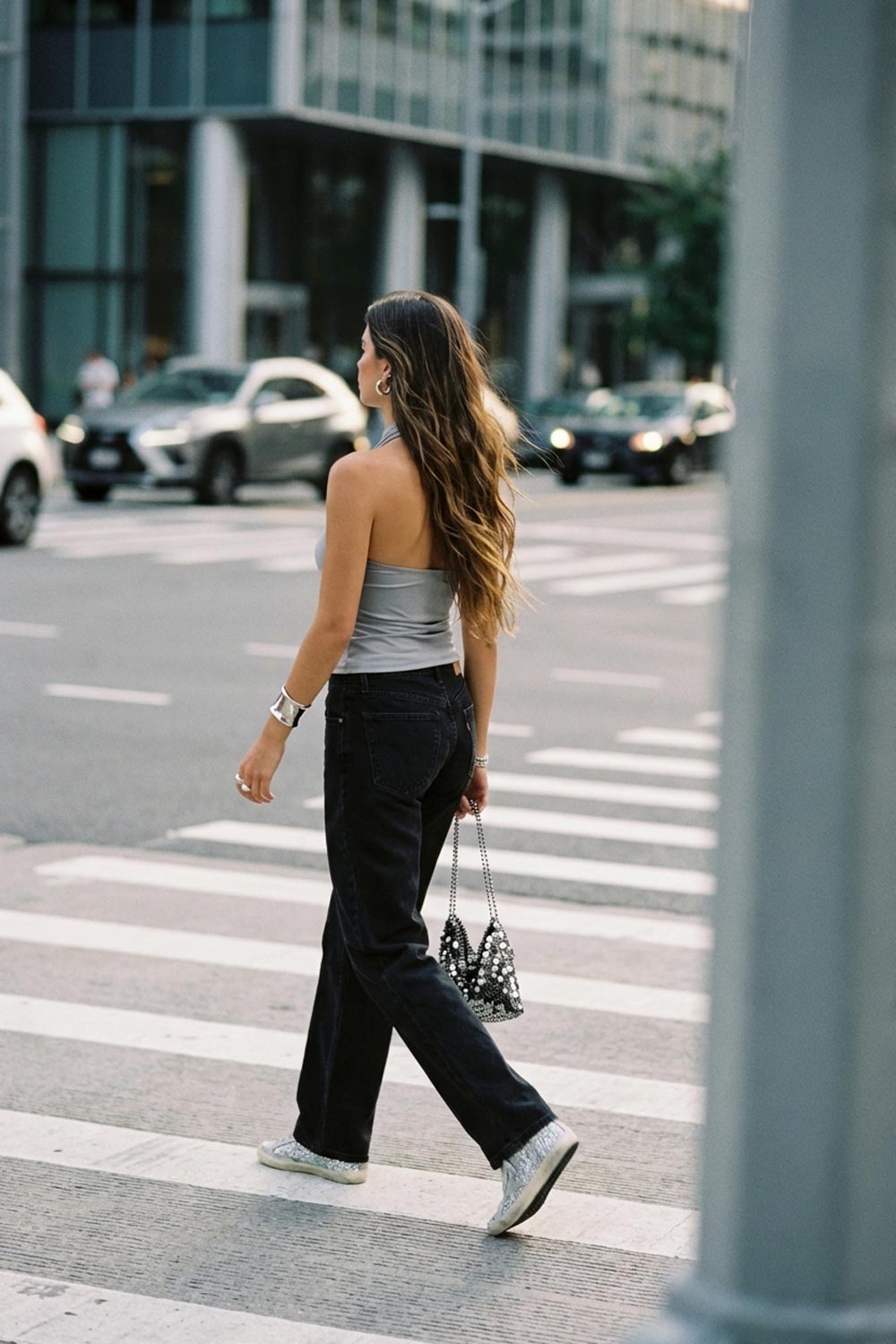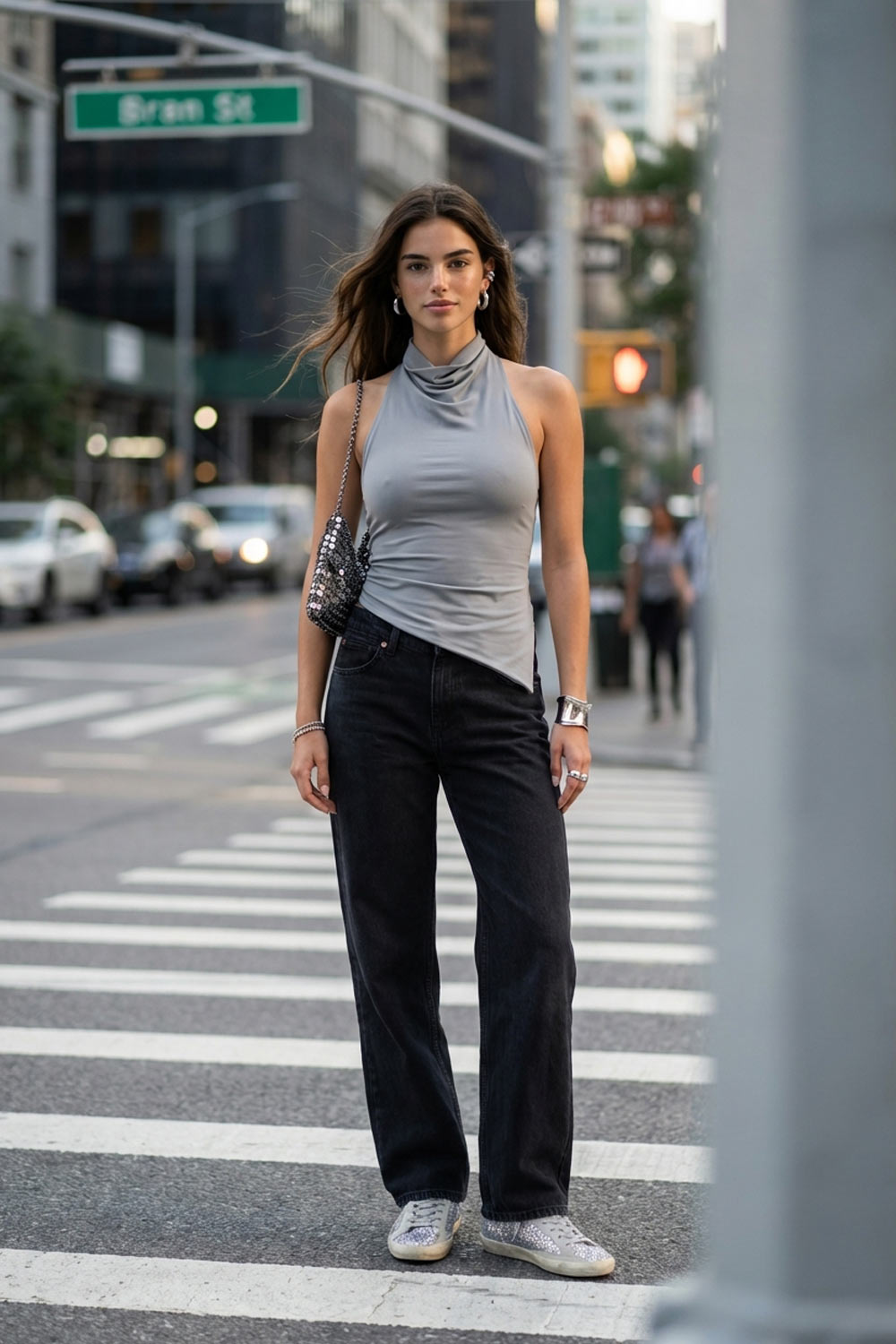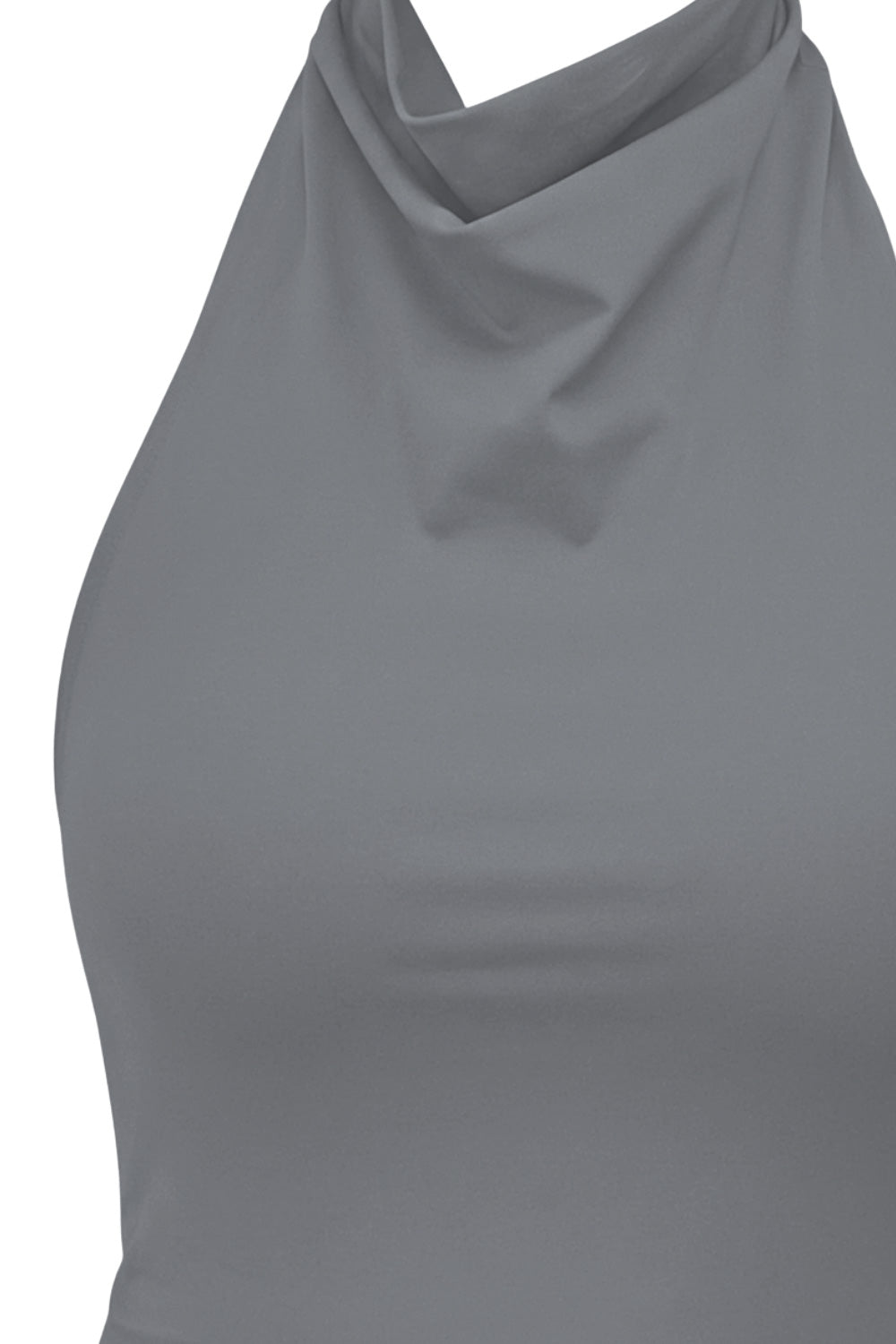 Top halter corto de fit ajustado, sin mangas, cuello halter fluido con plisados y escote en espalda. Detalle de bajo diagonal asimétrico.