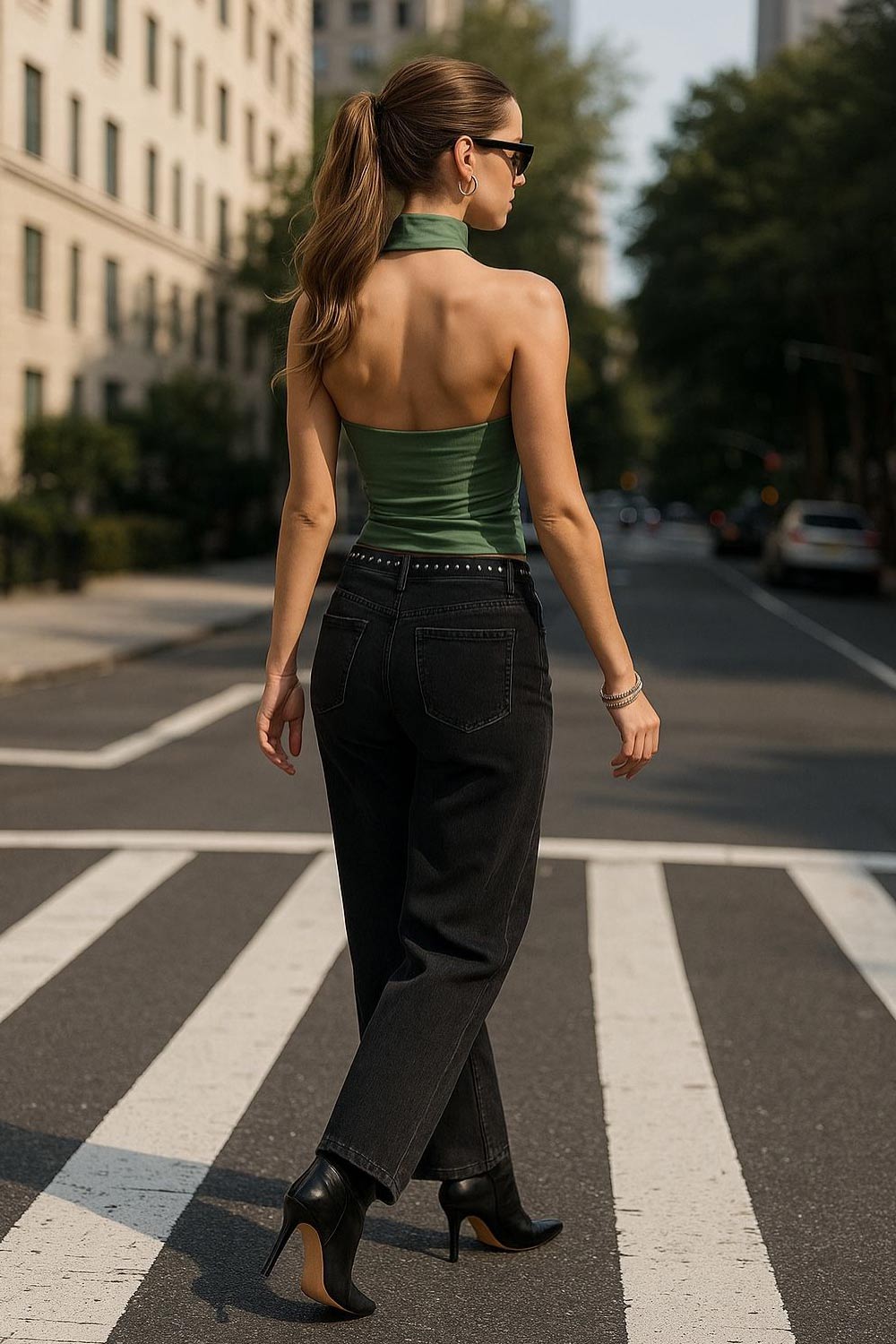 Top halter corto de fit ajustado, sin mangas, cuello halter fluido con plisados y escote en espalda. Detalle de bajo diagonal asimétrico.