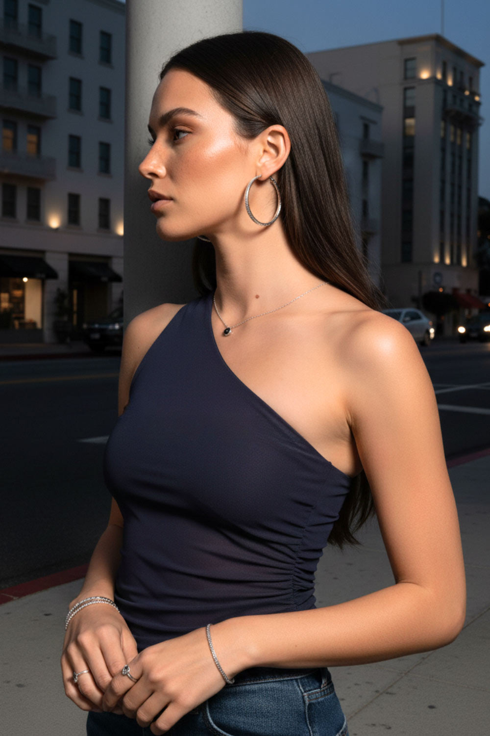 Top corto asimétrico de mesh, fit ajustado, un hombro, escote diagonal, sin mangas, detalles plisados en costado y bajo asimétrico con rib en borde.